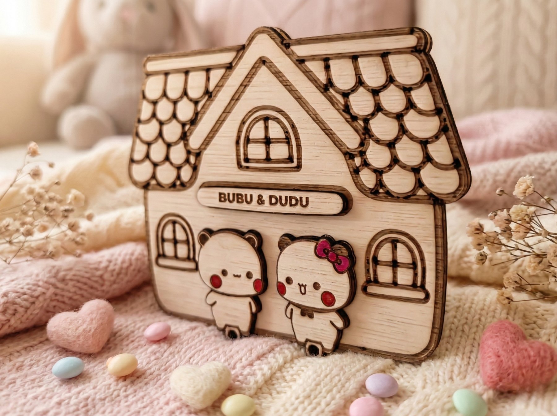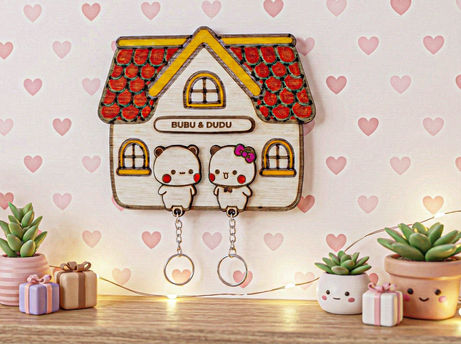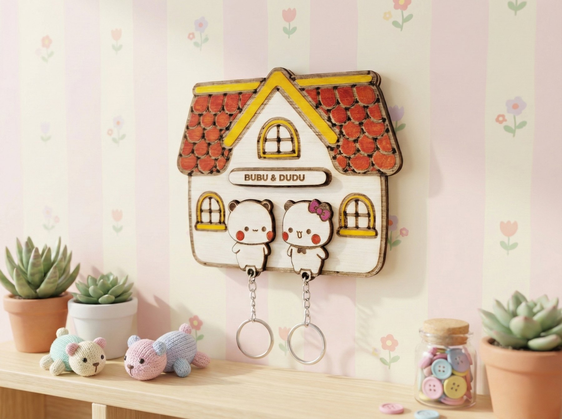 Przedstawiamy uroczy, ręcznie robiony wieszak na klucze, keyholder z motywem viralowych misiów "Bubu i Dudu". To nie jest zwykła dekoracja – to funkcjonalny gadżet, który sprawi, że Wasze klucze zawsze będą miały swoje miejsce, a Wy poczujecie się wyjątkowo.